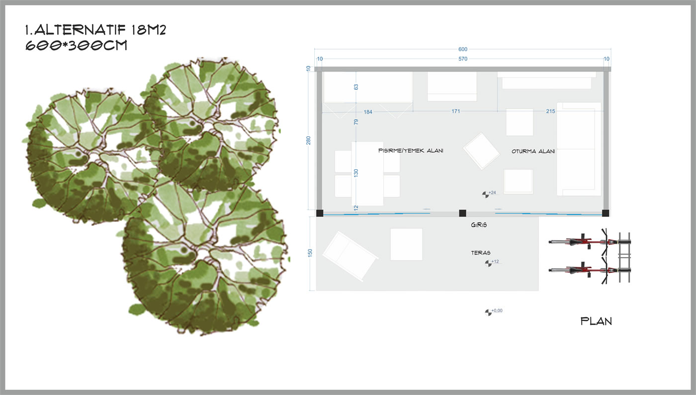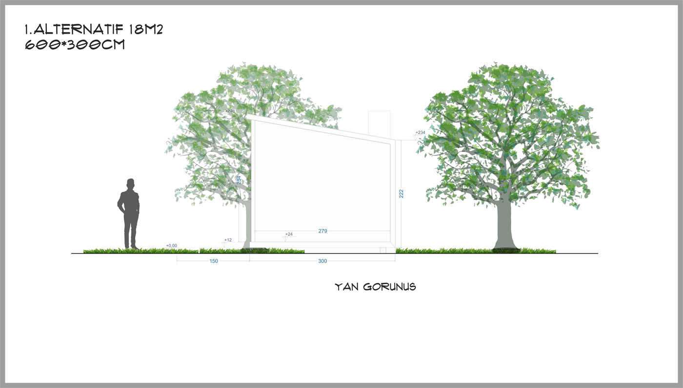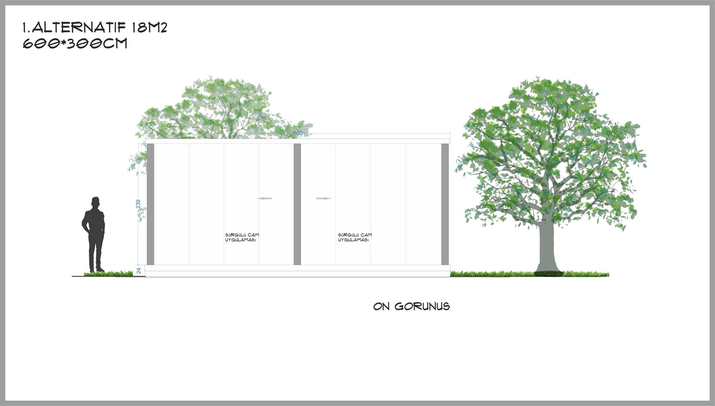 3m derinliğinde 6m genişliğinde toplam 18m², yerden 60cm yüksek taban alanı, 230cm yüksekliğinde tavan